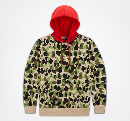 Dành cho những bạn trẻ yêu thích họa tiết camo rằn ri đây ạ, chiếc áo mang tên Camo Block Graphic Pullover Hoodie này hội tụ đủ những yếu tố mà các bạn trẻ yêu thích. Từ họa tiết độc đáo, trẻ trung, chiếc mũ đằng sau lưng cũng được các nhà thiết kế của Converse tạo ra điểm nhấn với tông màu đỏ nổi bật. Phía sau lưng của chiếc áo cũng được in logo mặt cười quen thuộc của Converse.