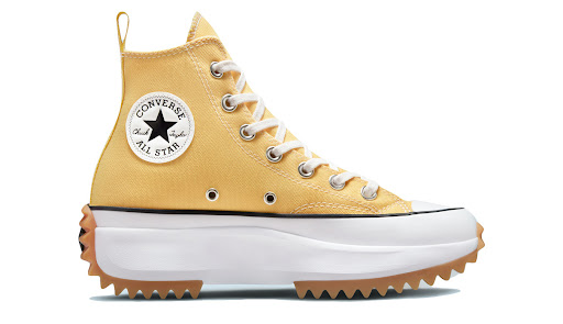Một trong những item mới mẻ, toát ra được sự trẻ trung và hiện đại của nhà Converse, không thể không kể tới Converse yellow sneakers Run Star Hike. Điểm nhấn của sản phẩm không chỉ bởi tông màu vàng cực tươi mới ở thân giày, mà còn ở chi tiết đế giày “hack chân” nổi bật nhất hiện nay. Những tông màu vàng - trắng - đen - nâu được hãng thể hiện một cách hiện đại và đẹp mắt, giúp các cô nàng dễ dàng sử dụng giày trong những buổi đi chơi đi học.
