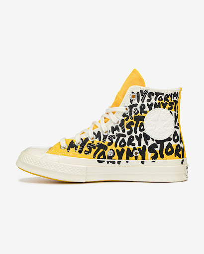Thiết kế theo hình hài của một đôi Chuck 70 đơn giản nhưng chi tiết ấn tượng của đôi Converse yellow Chuck 70 My Story Hi Trainers này đó chính là ở dòng chữ My Story được lặp đi lặp lại, in nổi bật sắc nét trên thân giày. Đối với những cô gái hiện đại, chi tiết này mang lại sức hút thú vị và như một cách thể hiện cá tính của các nàng.