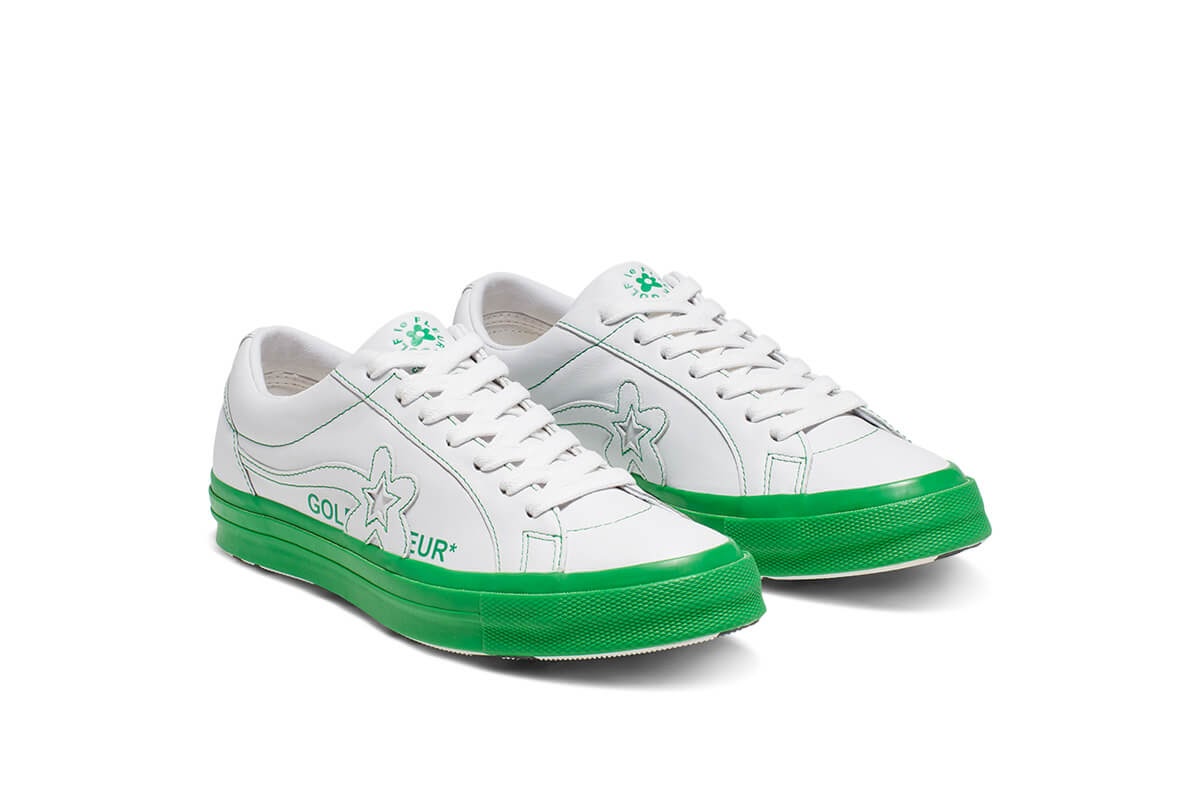 Một chiếc giày xanh lá cây nhưng không hề khiến chúng ta khó chịu bởi màu xanh được thiết kế khéo léo ở phần đế giày và dây giày. Trên nền trắng, những họa tiết màu xanh càng trở nên độc đáo và ấn tượng hơn, một sản phẩm khiến các chàng trai tha hồ thể hiện gu thời trang và cá tính của mình đến từ BST GOLF le FLEUR* của Converse.
