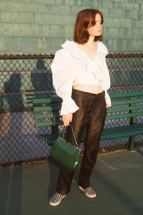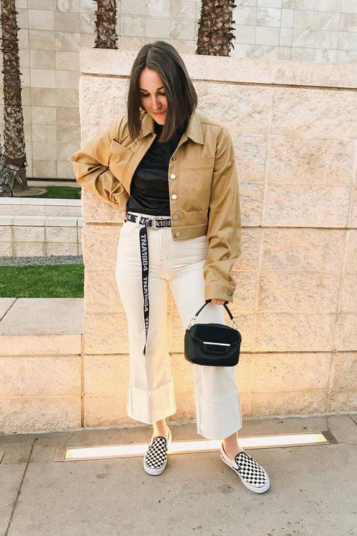 Một chiếc quần Jeans trắng, áo đen trơn ở trong cùng áo khoác denim màu nâu ở ngoài, phối thêm các chi tiết sắc sảo như thắt lưng vải và một chiếc túi lạ mắt, bạn sẽ trông thật hút mắt với họa tiết checker ở dưới chân.