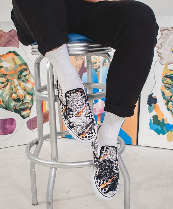 Ngoài ý tưởng thiết kế về mặt hình ảnh, Nikko Pelaez còn thể hiện được gu thẩm mỹ cực chất của mình bằng việc lựa chọn phiên bản giày slip on để thể hiện tốt nhất ý tưởng của mình.